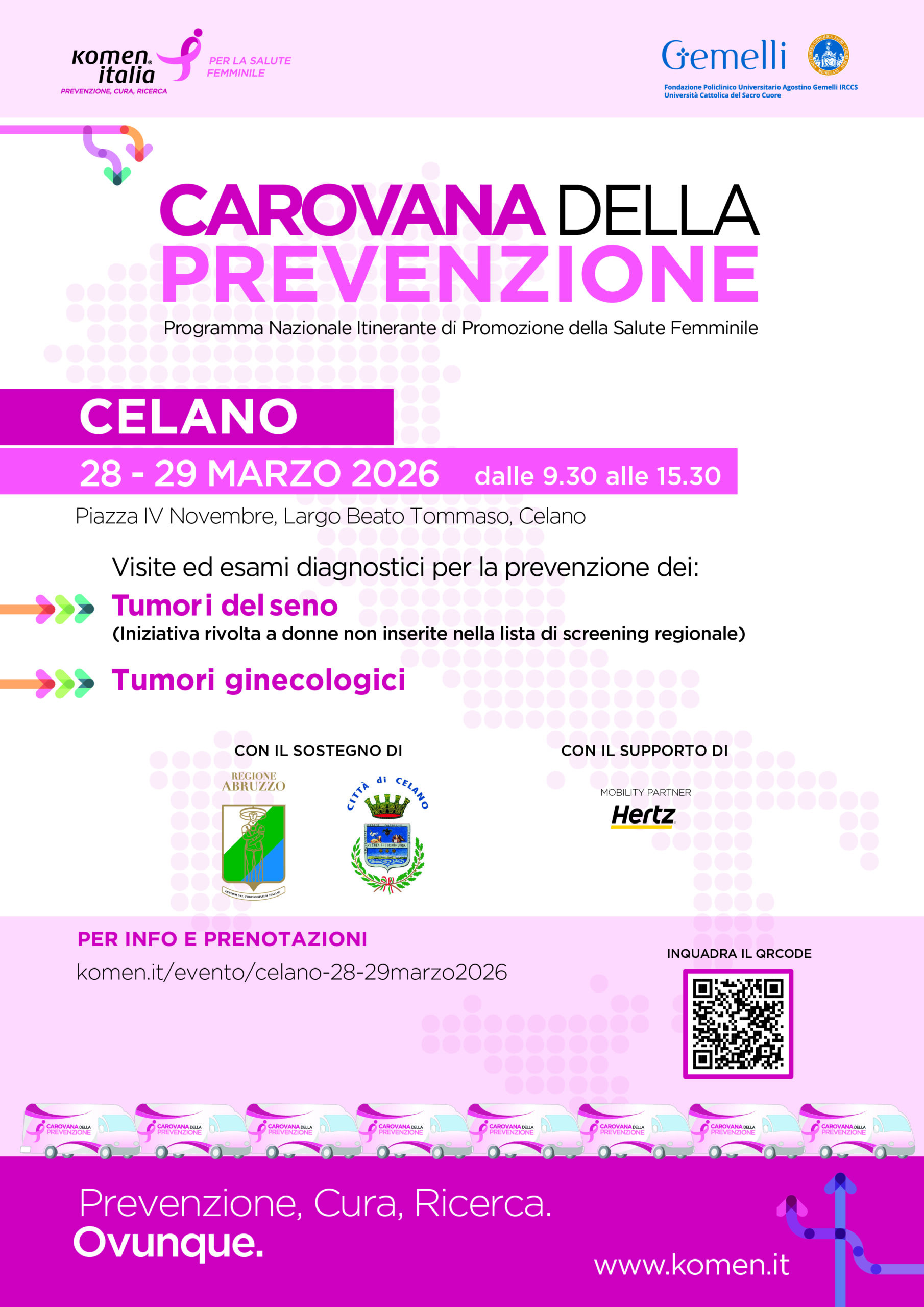 “L’obiettivo dell’iniziativa è portare la prevenzione sempre più vicino alle persone – prosegue il Vicesindaco Piero Ianni –. Komen Italia rappresenta una realtà di assoluto rilievo, impegnata da anni nella diffusione della cultura della prevenzione e nella tutela della salute femminile. I tumori del seno, purtroppo, continuano a rappresentare una delle principali cause di incidenza oncologica nella popolazione femminile; per questa ragione rivolgo un invito sentito alle donne celanesi a partecipare, secondo le fasce di età previste.”
