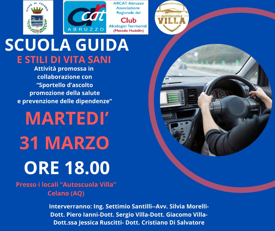 Si terrà martedì 31 marzo alle 18:00, all'Autoscuola Villa di Celano, un incontro aperto al pubblico dedicato ai giovani riguardo agli stili di vita sana, in particolare per chi si appresta a guidare un veicolo. L'evento è stato fortemente voluto ed organizzato dalla Presidente del Consiglio Comunale, Avv. Silvia Morelli, in collaborazione con lo sportello d’ascolto per la promozione della salute e la prevenzione delle dipendenze, attivo a Celano dal 2020 e diretto con impegno dal Dott. Cristiano Di Salvatore, insieme all'associazione ARCAT.